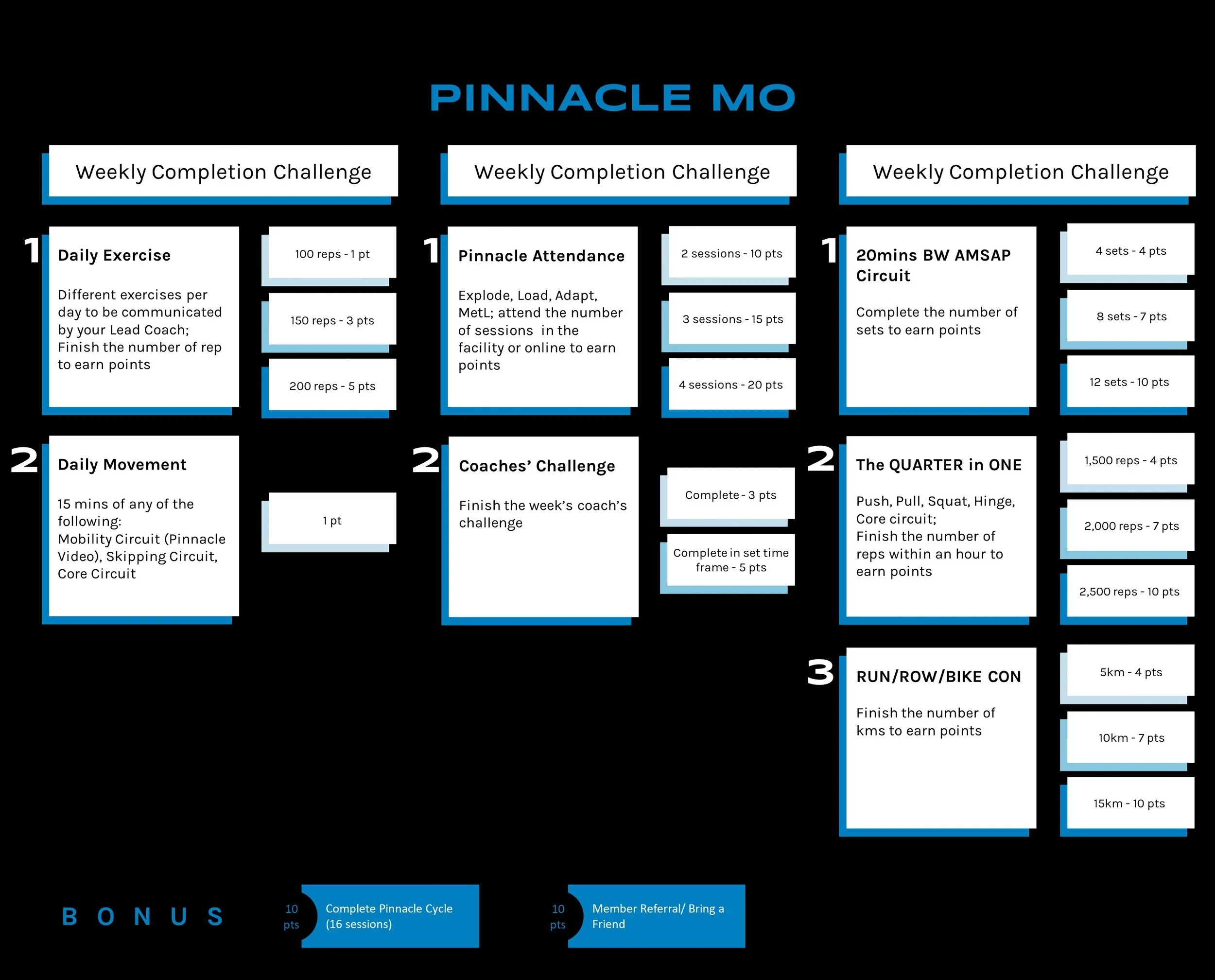Pinnacle MO is a 4-week long challenge where athletes are given a list of activities with corresponding points. Pinnacle MO’s objective is to challenge each athlete’s work capacity while giving each athlete a target of their own. The total number of points you earn by the end of the cycle puts you either in the Principle, Clinical or Pinnacle ranks.